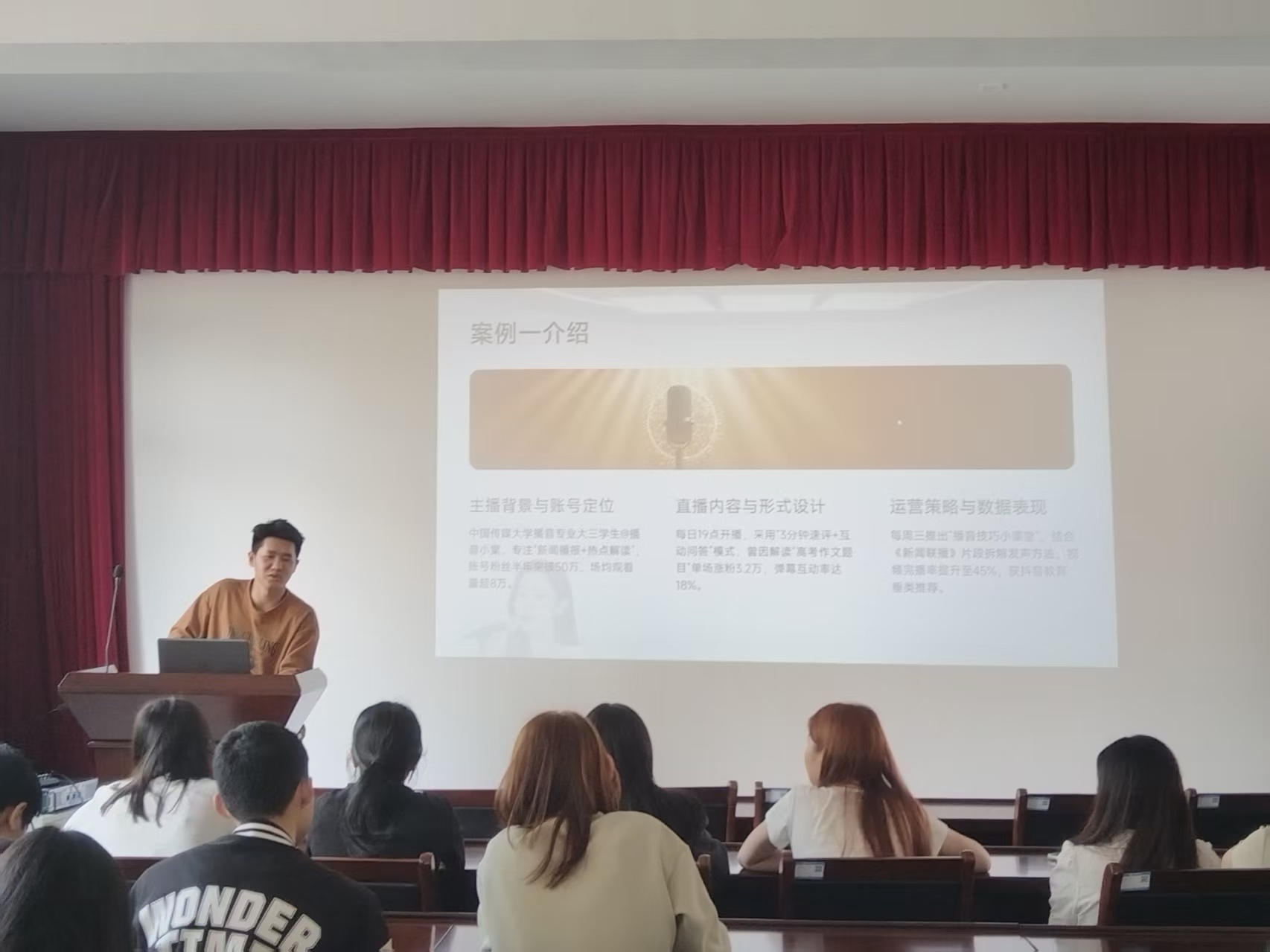 讲座上,刘勇立足播音与主持艺术专业的学科特点,细致剖析直播与播音在技术支撑、传播内容、能力要求等方面的联系与区别,深入阐释本专业学生在直播行业中的独特优势。他系统梳理了适合播音与主持艺术专业学生尝试的直播赛道,并结合知名网络主播的典型案例,生动展现直播行业的就业前景与发展趋势。整场讲座内容翔实、视角新颖,帮助同学们全面把握行业现状,为明晰未来发展方向提供了有益参考。参与学生纷纷表示,通过此次讲座,不仅对直播行业有了更清晰的认识,也对自身在行业中的优势与发展方向有了更深入的理解。