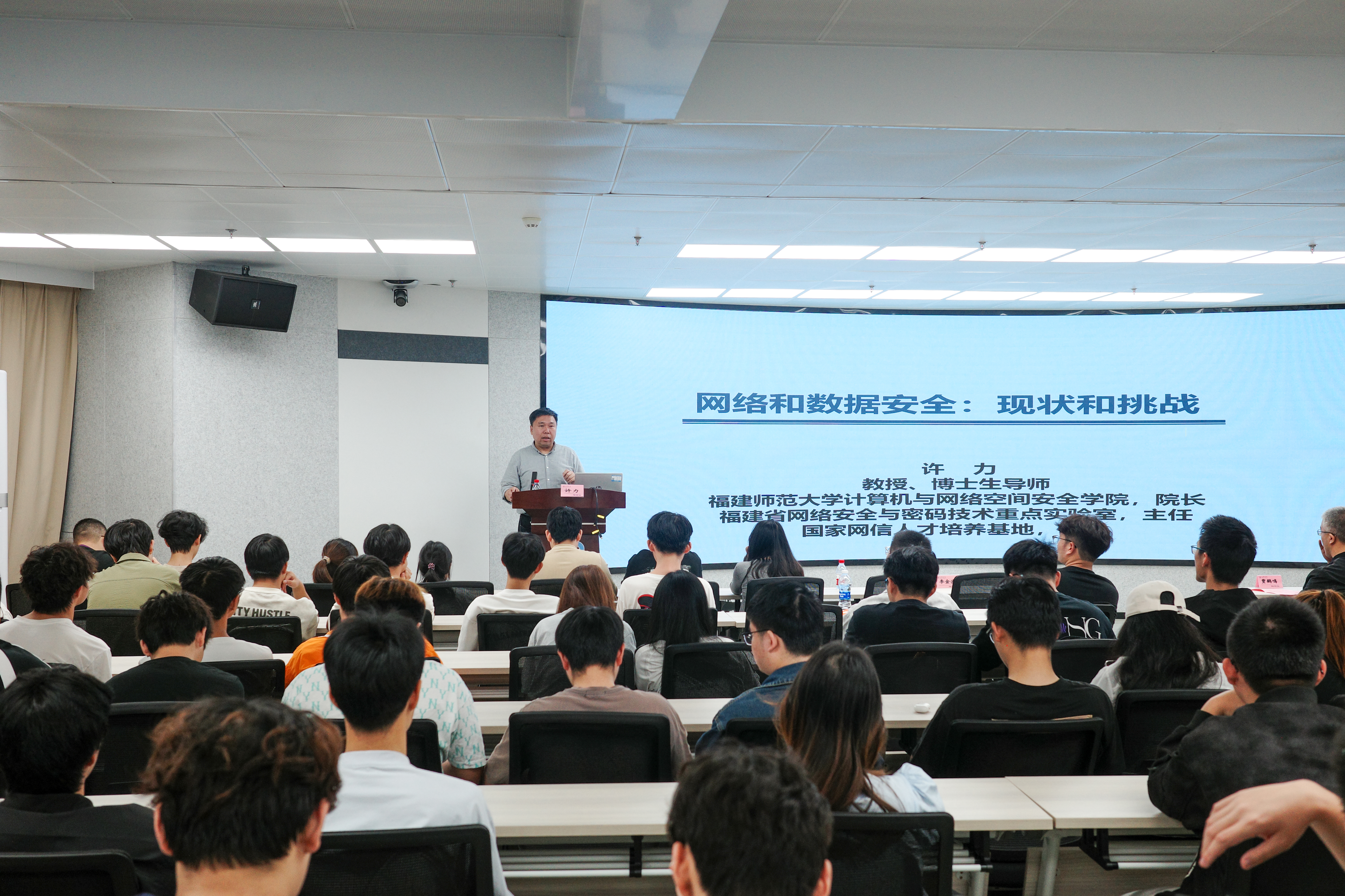 讲座中,许力教授围绕网络空间安全这一核心议题,从国家经济、社会、文化及军事等领域的战略需求出发,系统阐释了网络空间的定义、内涵与战略价值。他结合国内外网络空间安全发展态势与行业需求,深入剖析了技术变革趋势,并围绕当前网络安全面临的新风险与新挑战,从前沿案例、技术攻关、管理体系、协同机制等多维度进行了综合解读。许力教授还结合自身多年科研与教学实践,对网络空间安全专业的发展方向与就业前景进行了梳理,鼓励学生扎根专业学习、投身科研实践、主动追踪行业前沿动态。