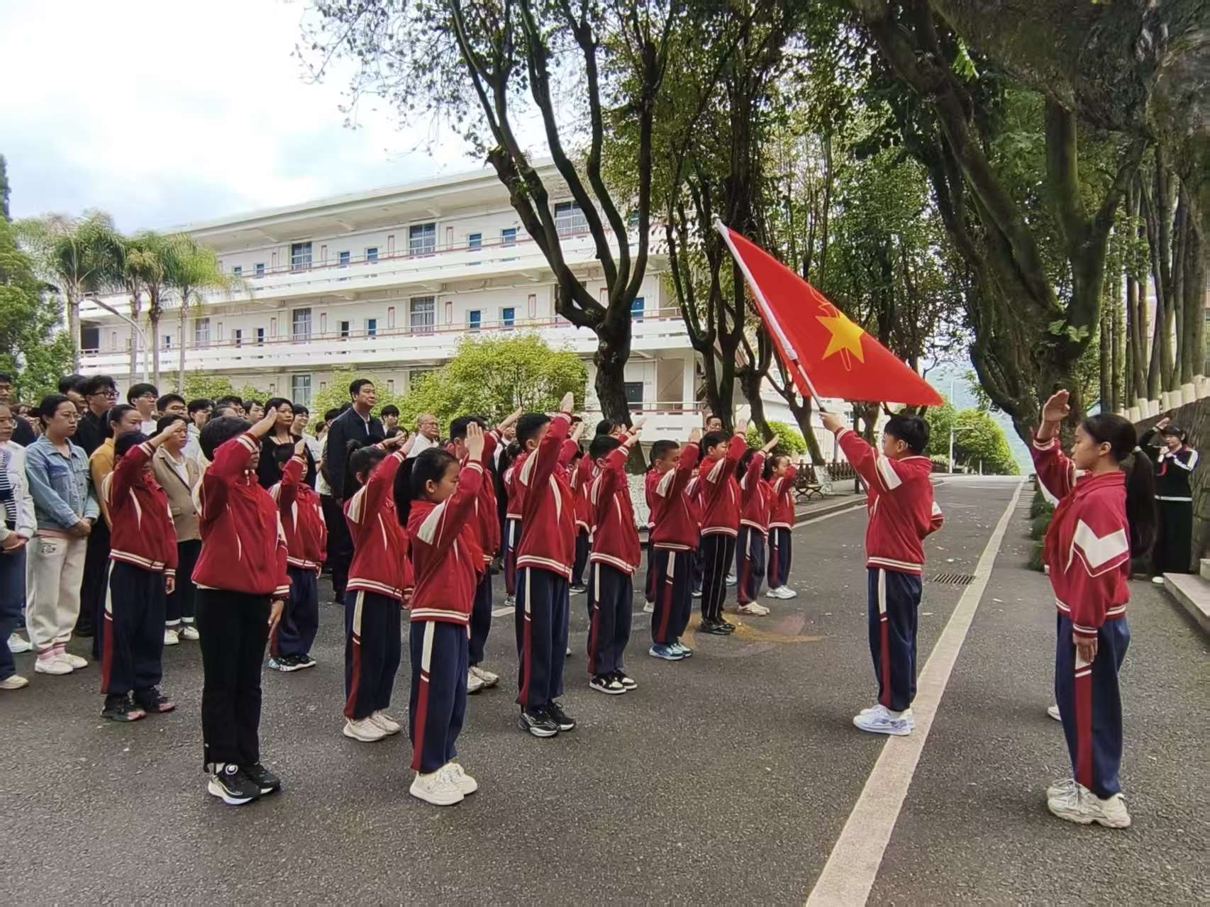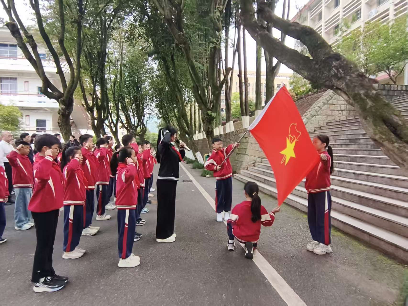 少先队出旗环节,旗手步伐坚定,护送队旗入场,全体少先队员庄严敬队礼,目光追随队旗。礼毕,少先队员献唱《中国少年先锋队队歌》,“我们是共产主义接班人,继承革命先辈的光荣传统……”,在大队辅导员的带领下,全体少先队员举起右拳,铿锵宣誓并呼号,稚嫩而坚定的声音在明德楼上空回荡。