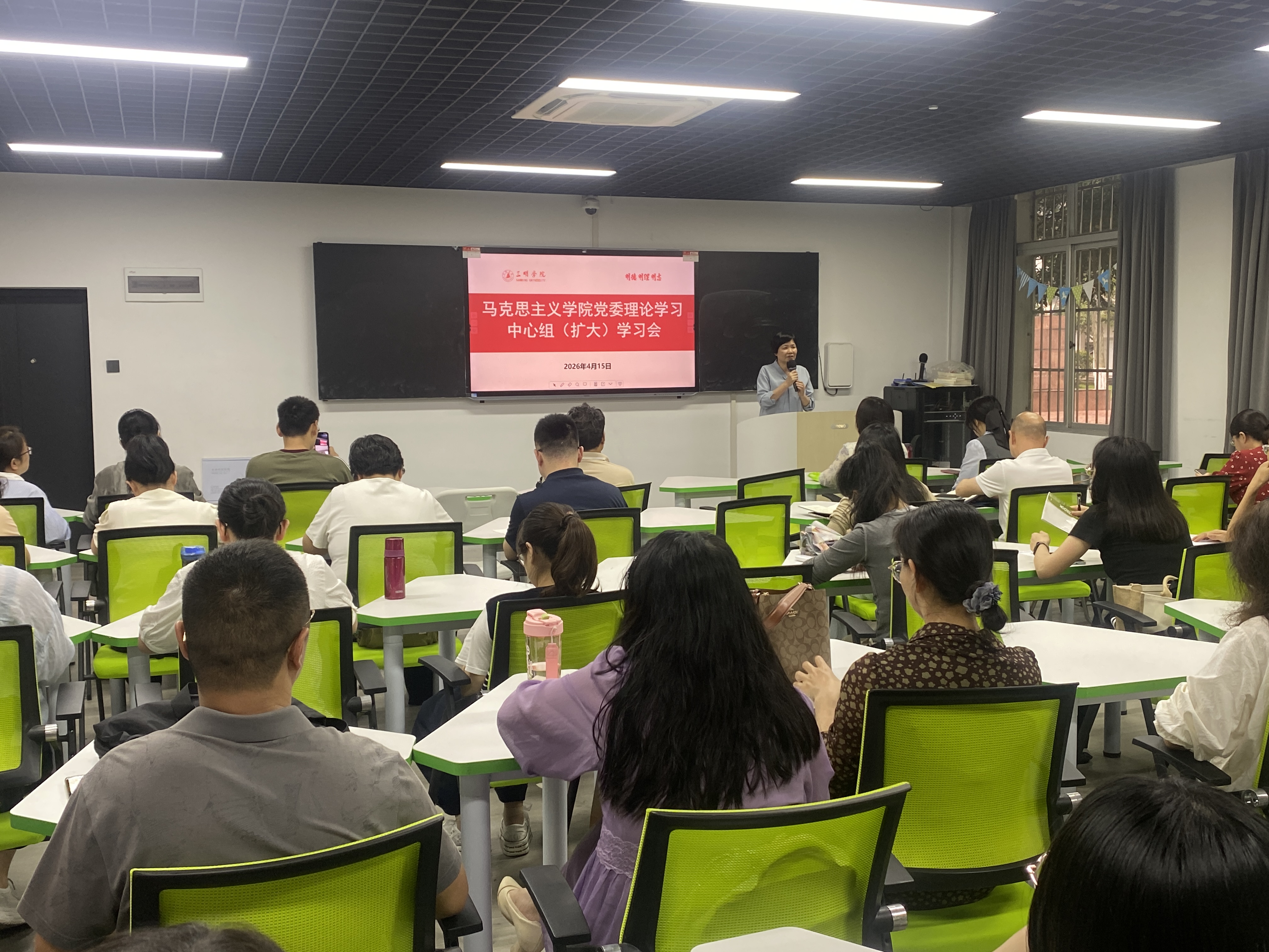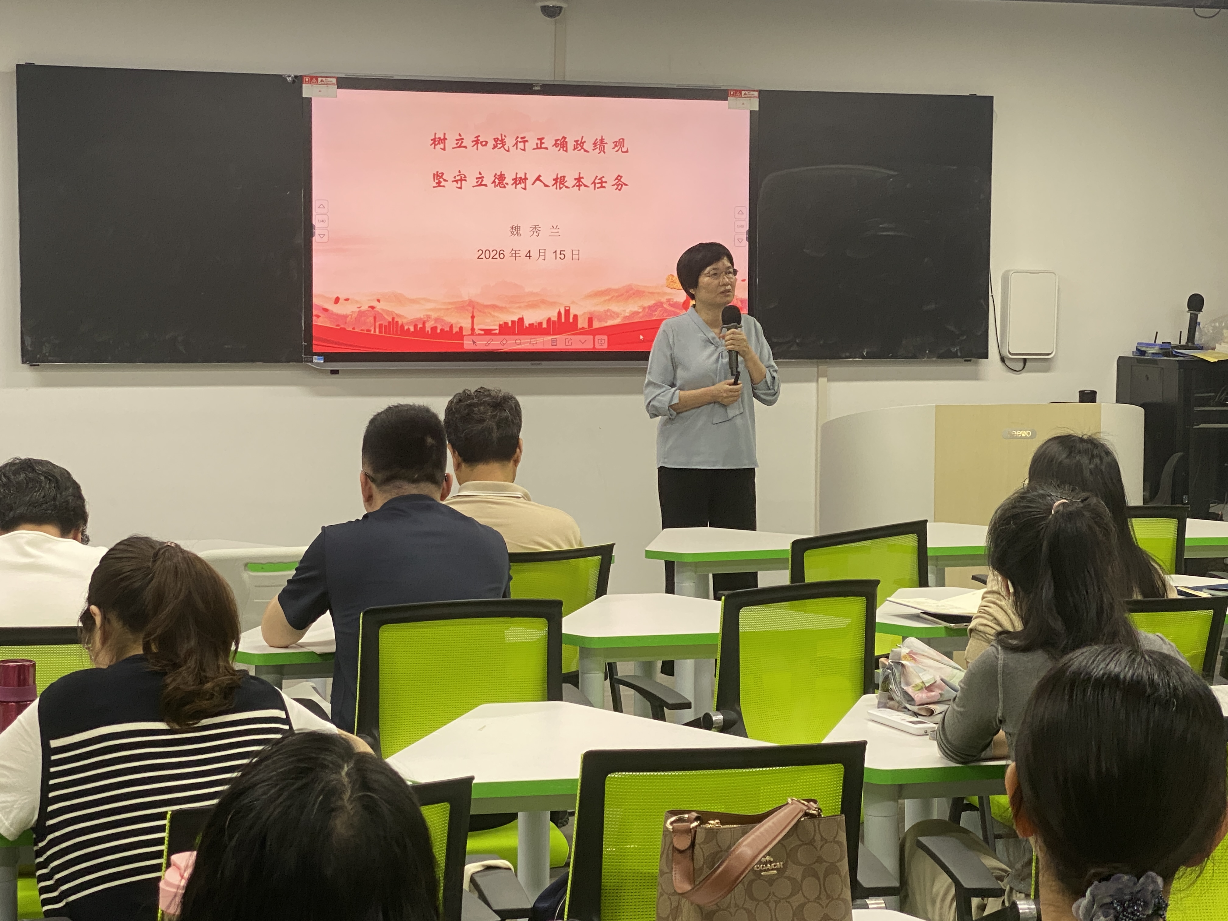 魏秀兰书记以树立和践行正确政绩观为主题,从习近平总书记关于树立和践行正确政绩观的重要论述及重要意义、深刻把握正确政绩观的核心要义、以正确政绩观推动立德树人根本任务落实三个方面,展开系统全面、深入浅出的论述。授课紧密结合马克思主义学院办学使命与工作实际,既有理论深度,又贴合育人实践,为全体党员深化思想认识、校准工作方向提供了有力指引。