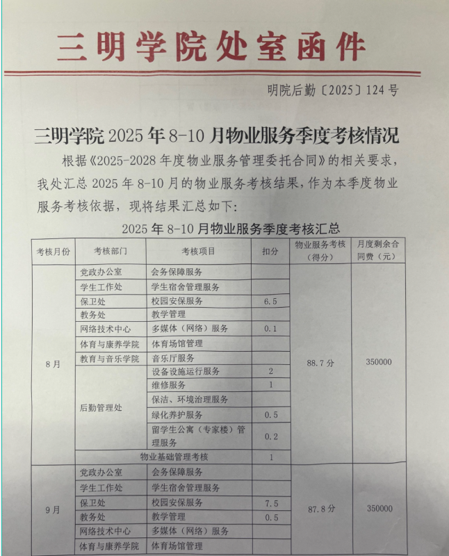 三明学院2025年8-10月物业服务季度考核情况公示