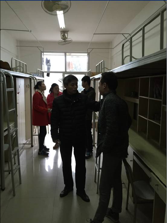 1月15日下午,我院党总支林光初书记率领团委、学生科和各年级辅导员深入学生宿舍检查期末安全卫生工作。