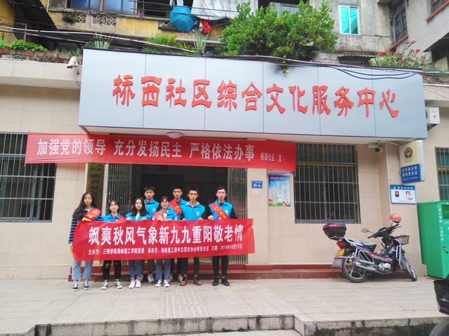 为进一步弘扬中华民族的传统美德,大力培育我校学生“老吾老以及人之老”的道德风尚,同时也希望能通过此次活动给老人们送去关怀,丰富老人的生活,让他们能在秋意中感受爱的温暖。我院青年志愿者协会联合三元区安监局三水小区物业,在桥西社区开展第以“飒爽秋风气象新 九九重阳敬老情”为主题的重阳节”活动。