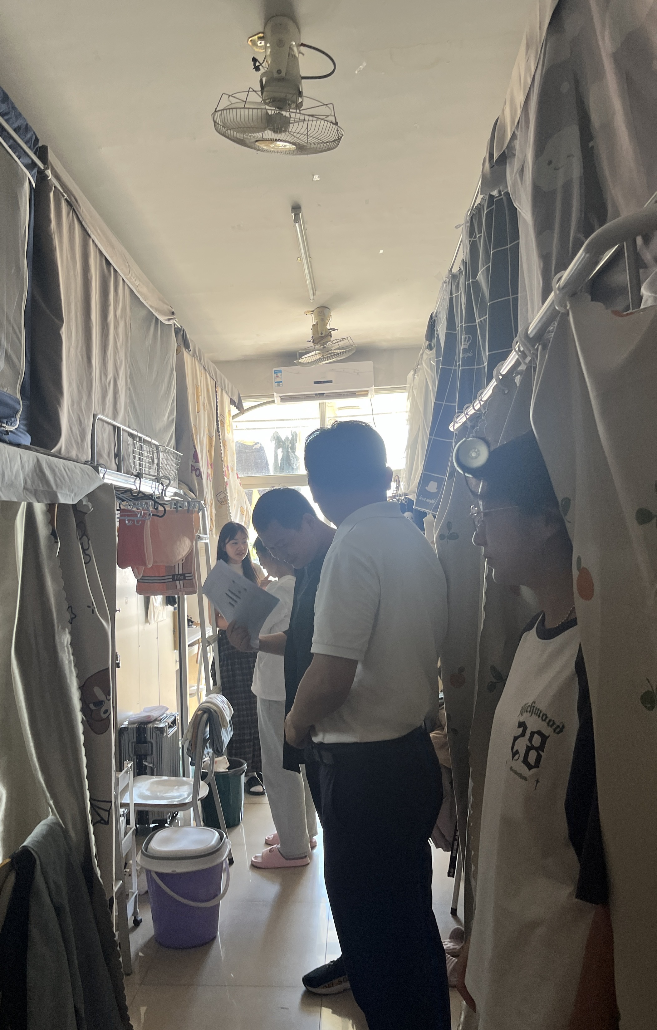 走访中,院领导重点对宿舍水电供应、门窗牢固度、家具完好性、空调运行状态等基础设施进行逐项检查。每到一间宿舍,都仔细查看床架、书桌是否存在安全隐患,并叮嘱随行工作人员对排查出的松动床板、损坏插座等问题,要登记造册,联系后勤部门24小时内整改到位,务必让新生住得安心、舒心。