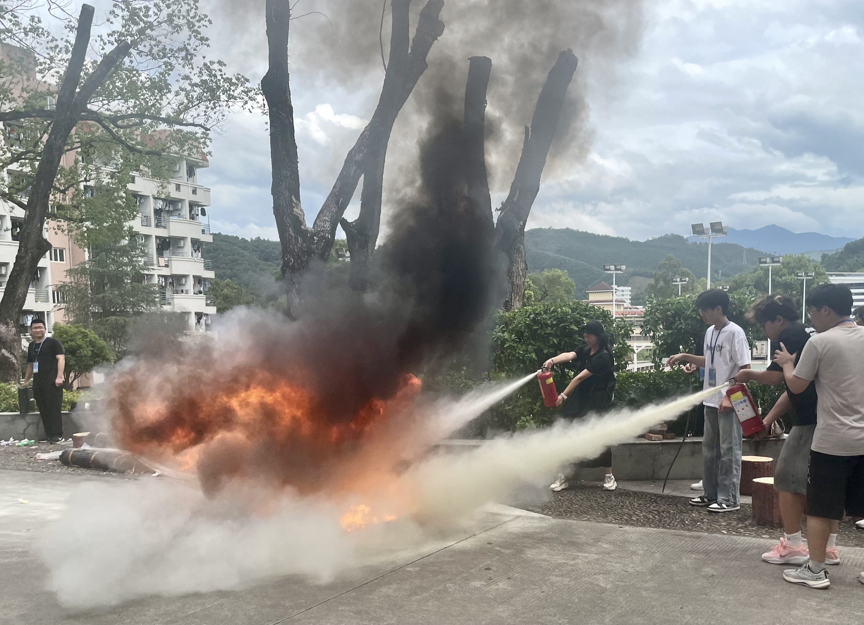 模拟火情发生在荷花苑5B栋楼内,现场通过烟雾弹还原真实火灾场景。随着一声哨响,新生们规范用湿毛巾捂住口鼻,保持低姿快速向安全区域撤离,全程展现出良好的纪律性与沉着的应对状态。保卫处消防团队现场演示了干粉灭火器、消火栓等消防器材的正确使用方法,并邀请新生真实演示灭火流程和技巧。