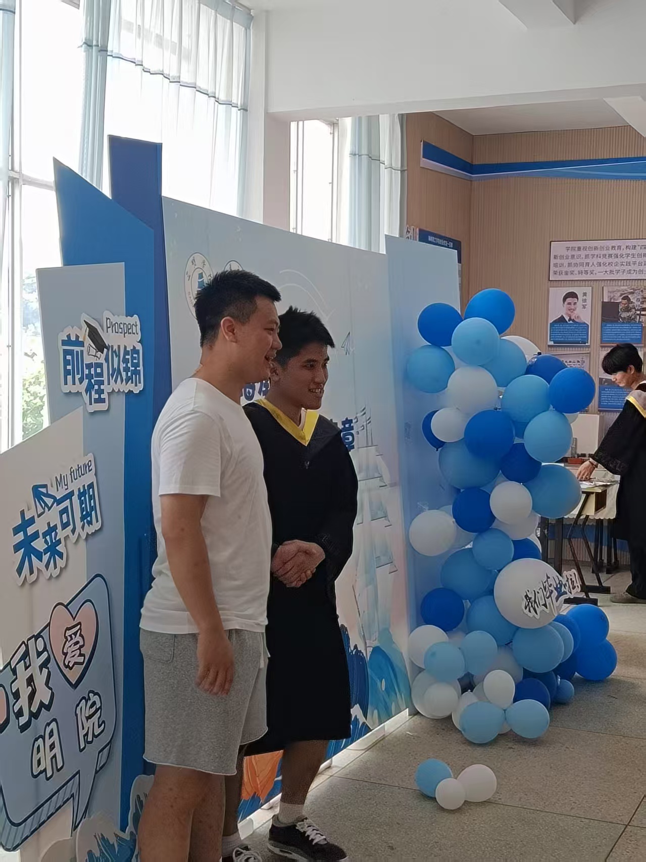 活动现场氛围感拉满,致用楼四楼大厅精心布置的“海理专属”打卡背景墙成为绝对焦点。背景墙上“前程似锦”“逐梦再出发”等暖心标语,搭配学院标志性元素,让每一位毕业生都忍不住驻足。大家或独自定格潇洒身姿,或与同窗好友相拥合影,或携师长留下珍贵瞬间,快门声此起彼伏,将与母校的独家记忆永远留存。