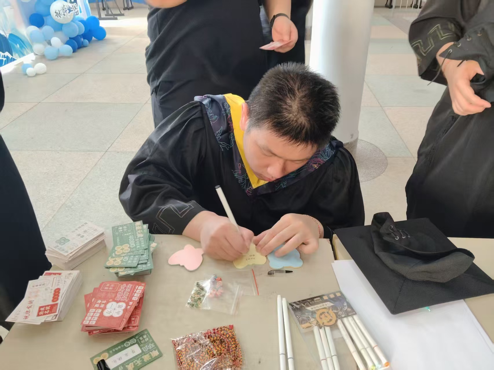 互动环节更是人气爆棚,刮刮乐惊喜派送与记忆拼图挑战两大活动让现场热度持续攀升。在“寄语墙”前,毕业生们提笔写下对母校的深切眷恋、对师长的诚挚谢意,以及对学弟学妹的殷切期许——“愿海理桃李芬芳,岁岁荣光”“以青春之名,赴时代之约”,一笔一划皆是青春的赤诚。完成留言后,大家手持刮刮乐满怀期待,祝福卡片、定制书签、实用文具等精美奖品接连送出,每一份惊喜都让笑容在脸上绽放。另一边的记忆拼图区,教学楼的红砖黛瓦、操场的茵茵绿草、图书馆的静谧书香等校园标志性场景化作拼图碎片,毕业生们分工协作、凝神拼接,在复原画面的过程中重温大学生活的点点滴滴,现场时而因思路卡顿陷入沉思,时而因完成拼接欢呼雀跃,欢乐与不舍的情愫在空气中交融。