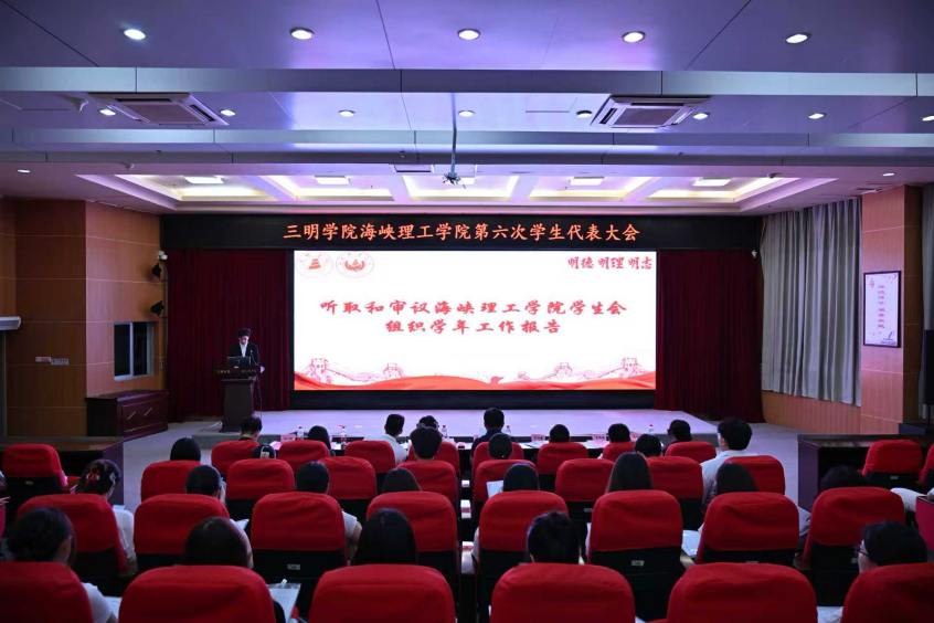 庄严的国歌声响彻全场,2025年9月23日晚,三明学院海峡理工学院第六次学生代表大会在图书馆四楼学术报告厅隆重开幕。海峡理工学院党委副书记陈勇、团委负责人杨梦琪、各专业辅导员出席会议,百余名经民主推选产生的学生代表齐聚一堂,共同见证这一凝聚青年力量的重要时刻,会场内座无虚席,气氛庄重而热烈。