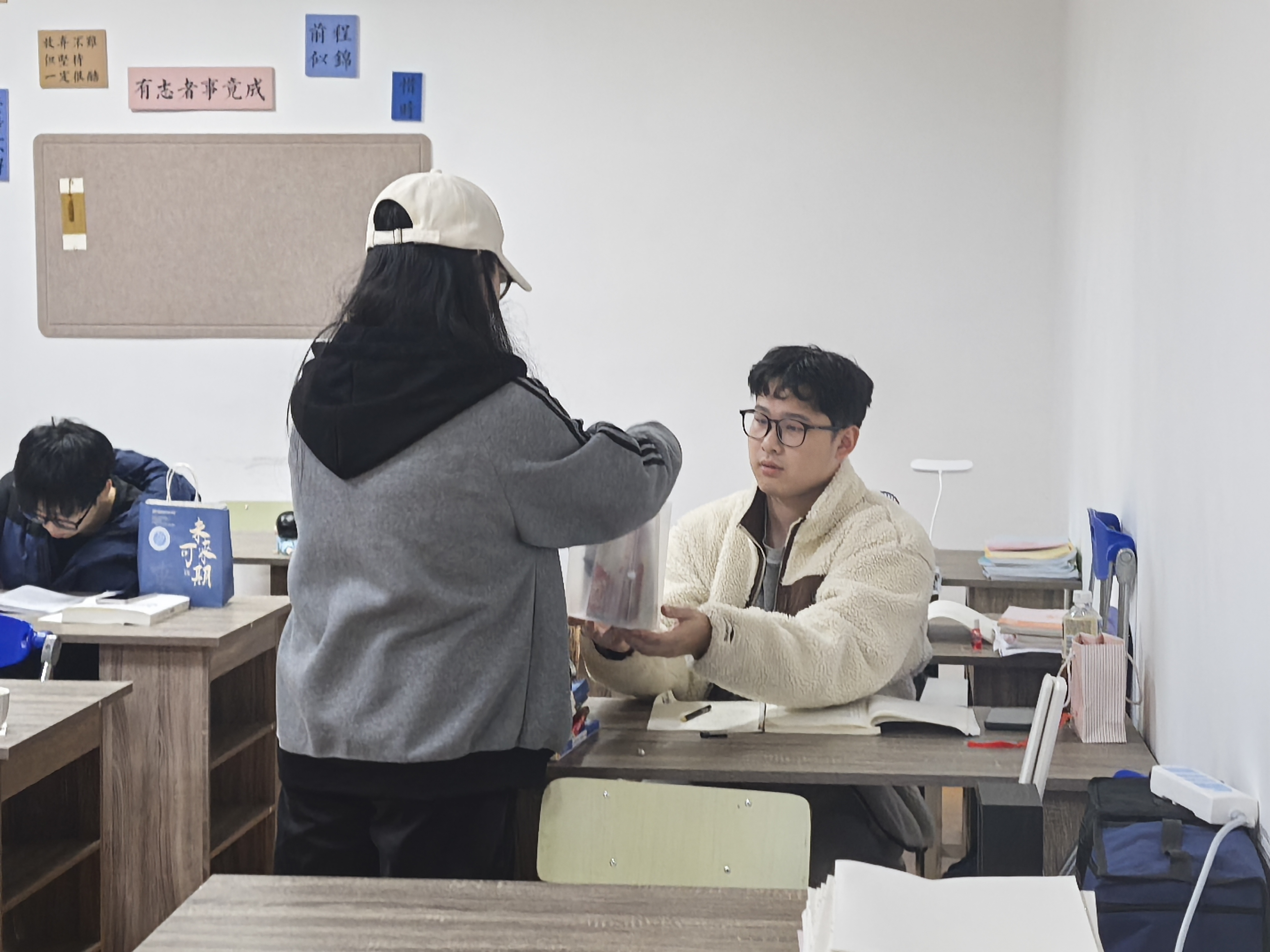 本次活动创新采用"自习室发放+志愿者配送"双模式运行。在考研自习室发放加油包,学生们有序领取;对于因复习任务繁重或身体不适无法前来的同学,学院特别安排志愿者提供上门配送服务,确保关怀覆盖到每一位备考学子。
