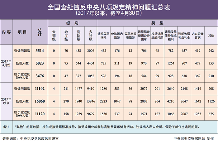 为掌握全国贯彻落实中央八项规定精神情况,中央纪委在31个省区市和新疆生产建设兵团、139个中央和国家机关、102个中央企业、15个中央金融企业建立了落实中央八项规定精神情况月报制度。2017年以来,截至4月30日,全国查处违反中央八项规定精神问题情况如下: