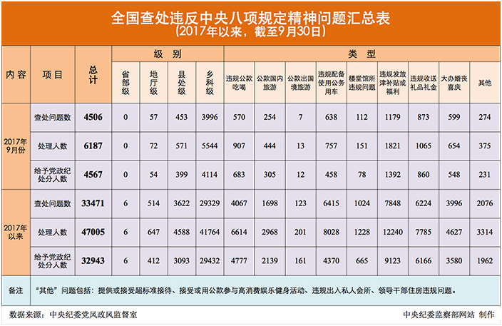 为掌握全国贯彻落实中央八项规定精神情况,中央纪委在31个省区市和新疆生产建设兵团、139个中央和国家机关、98个中央企业、15个中央金融企业建立了落实中央八项规定精神情况月报制度。2017年以来,截至9月30日,全国查处违反中央八项规定精神问题情况如下:
