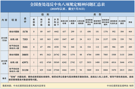为掌握全国贯彻落实中央八项规定精神情况,中央纪委在各省区市和新疆生产建设兵团、各中央和国家机关、各中央企业和中央金融企业等建立了落实中央八项规定精神情况月报制度。2018年以来,截至7月31日,全国查处违反中央八项规定精神问题情况如下: