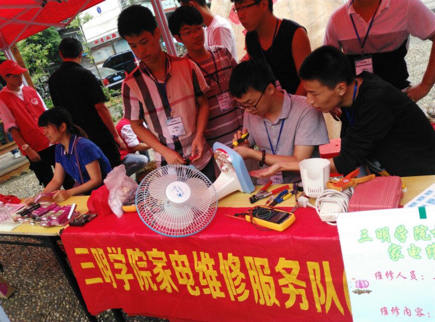 服务市区人民,巩固实践品牌。活动期间,机电工程学院的家电维修队成员们带着维修工具,早早来到了三明广场。小区市民见维修队又来进行志愿服务,纷纷回家取来故障的家电。家电维修服务队队员们迅速地开展免费家电维修工作。