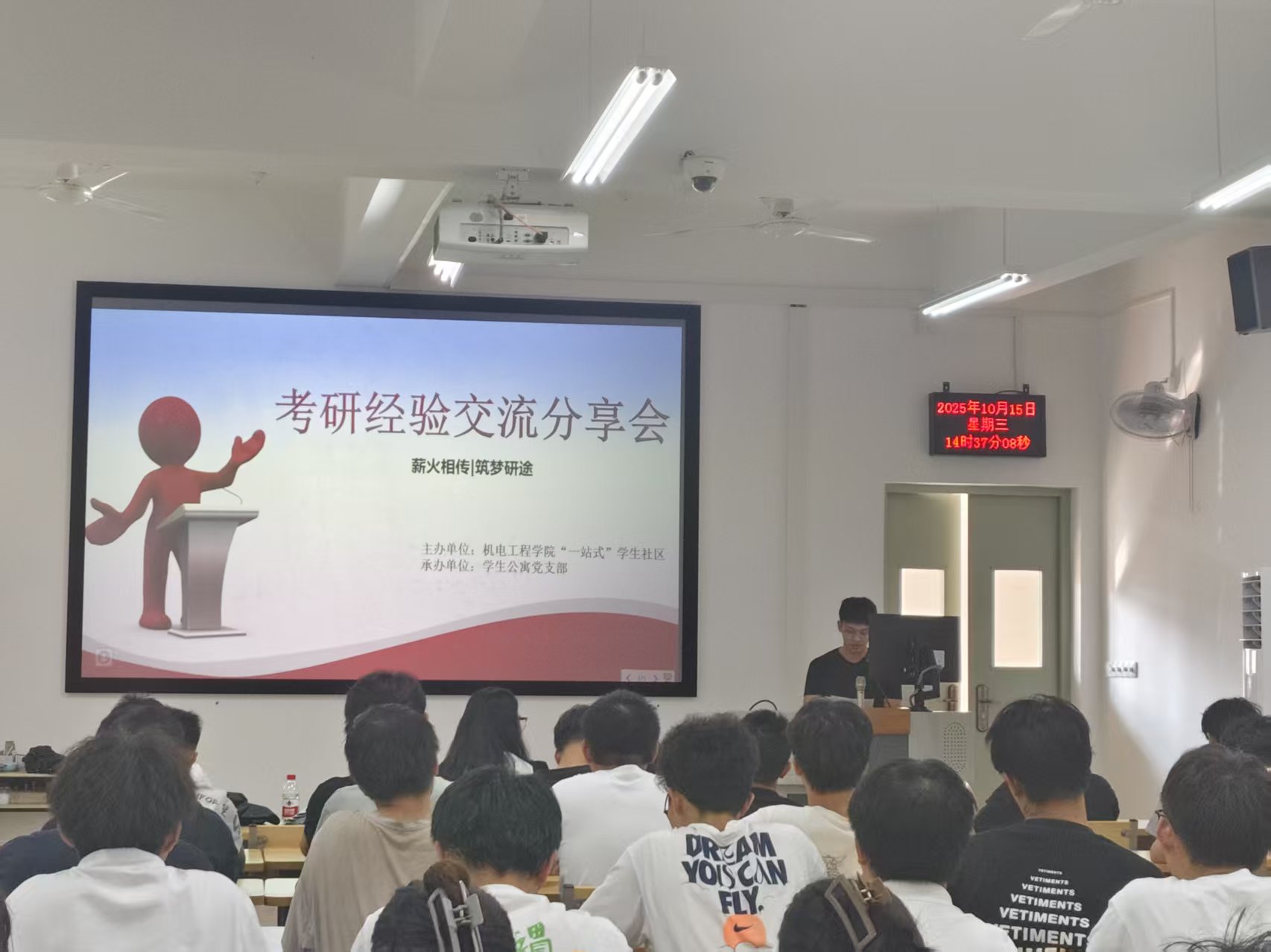 为充分发挥首届研究生党员先锋模范作用,10月15日下午,机电工程学院“一站式”学生社区在工科楼B601举办考研经验分享会。会议由学生公寓党支部、机械硕士研究生党员代表主讲,2023、2024级备战“考研”本科生参加了活动。