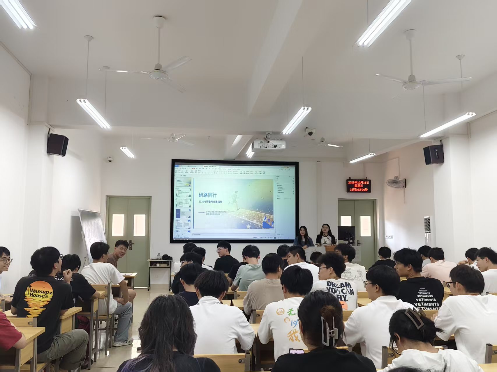 分享会上,研究生党员代表们结合自身备考经历,系统梳理了考研关键节点,围绕院校选择、复习规划、资源获取等常见问题,提供具有机械学科特色的实用建议。分享了公共课与专业课的高效学习方法,帮助本科生构建清晰备考框架。同时结合实际经验,就心态调整、时间管理等内容提供了具体指导和建议。交流环节,本科生围绕专业课学习、复试准备等内容踊跃提问,研究生党员们进行了细致解答,收获了同学们的阵阵掌声。