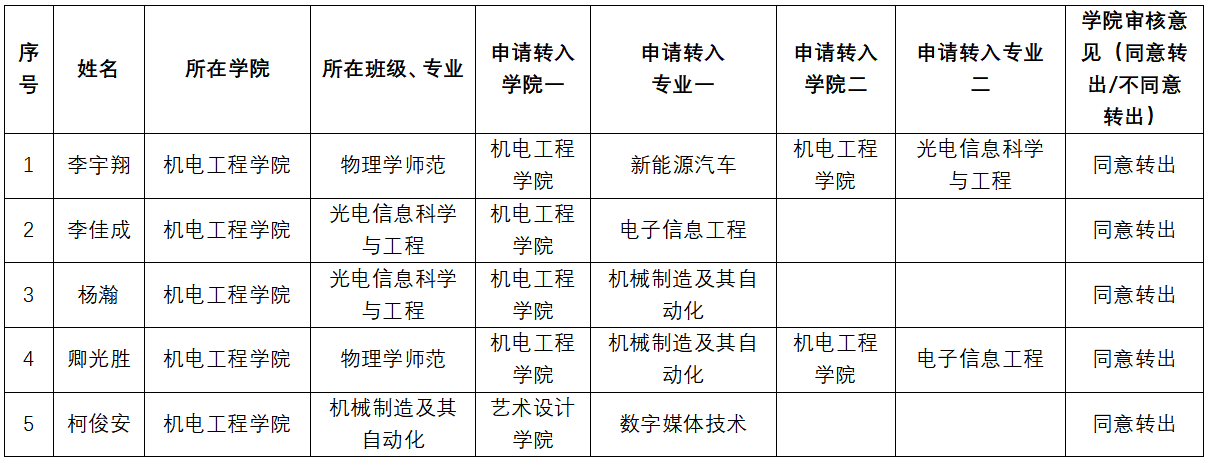 经个人申请,党政联席会议审议,同意李宇翔等同学转专业申请(转出),特此公示。