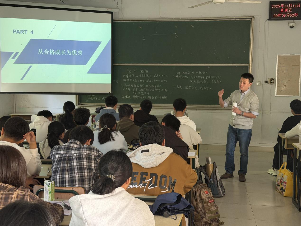 11月14日上午,机电工程学院邀请列东中学副校长陈中元开展主题为《物理学专业导论》的讲座,物理系教师代表、25级物理学全体学生参加。