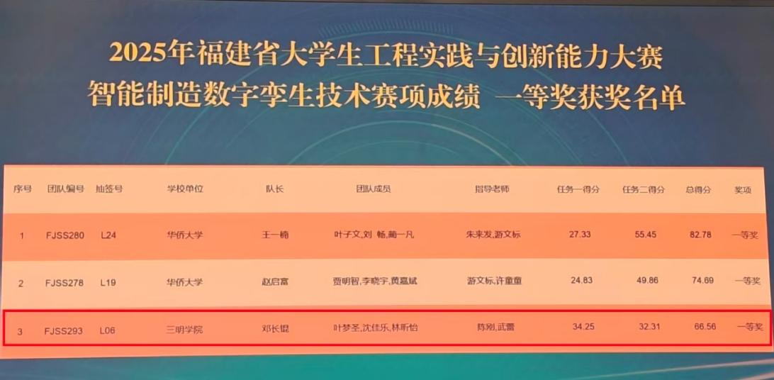 近日,2025年福建省大学生工程实践与创新能力大赛省级决赛在福州大学落幕,机电工程学院车辆工程专业学生团队,在陈刚、艾子健等教师指导下,斩获智能制造数字孪生技术赛项省级一等奖、二等奖各1项。