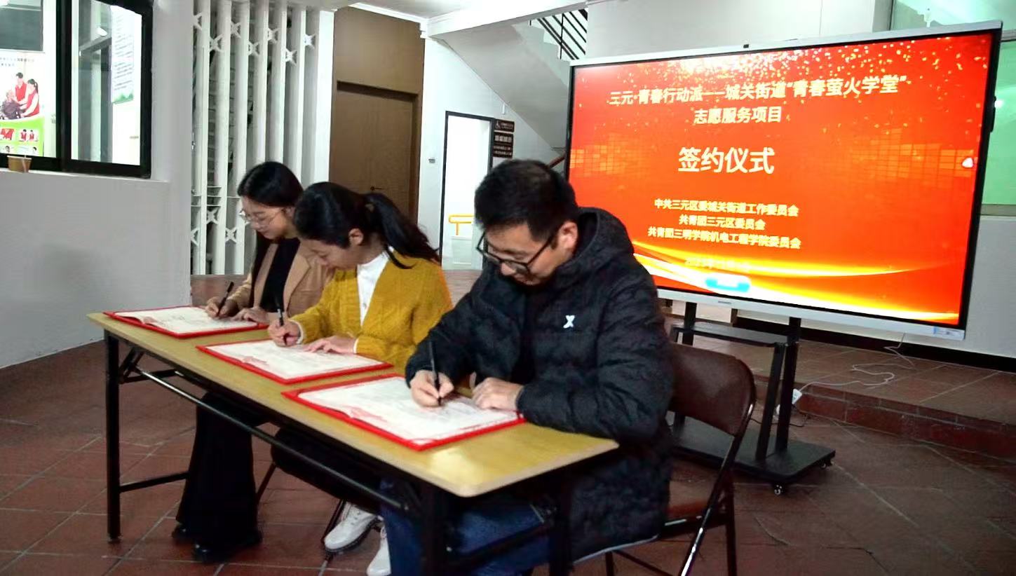 12月1日,机电工程学院团委与共青团三元区委员会、共青团三元区委街道工作委员会,就城关街道“青春萤火学堂”志愿服务项目举办签约仪式。机电工程学院党委副书记郑时鑑、院团委负责人、三元团区委书记黄蕾、城关街道统战委员、人武部长谈弢以及学生志愿者参加仪式。