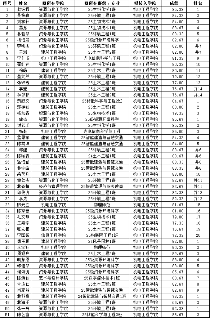 根据《三明学院普通全日制本科生转专业管理办法》文件精神,经学生本人申请、学院组织考核,现将2025-2026学年第一学期转专业拟接收名单公示如下: