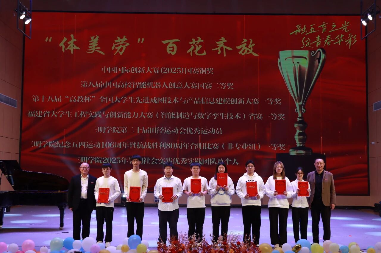 在“德”行之范篇章,同学们用旋律与舞步传递向上向善的青春能量,展现机电学子昂扬的精神风貌。在“智”学之巅篇章,四名首届研究生代表以一段风趣而深情的“三句半《颂党恩、跟党走》”,表达了青年一代坚定的理想信念;师生代表同台演绎融合多民族与时代特色的模特秀,呈现文化交融的视觉盛宴。在“体美劳”百花齐放篇章,陈荣辉书记、高浩院长、学生代表共同献上的朗诵节目,传递出拼搏奋进的集体心声;退伍军人代表带来的器乐合奏,以刚健昂扬的旋律致敬军人本色,彰显热血担当。