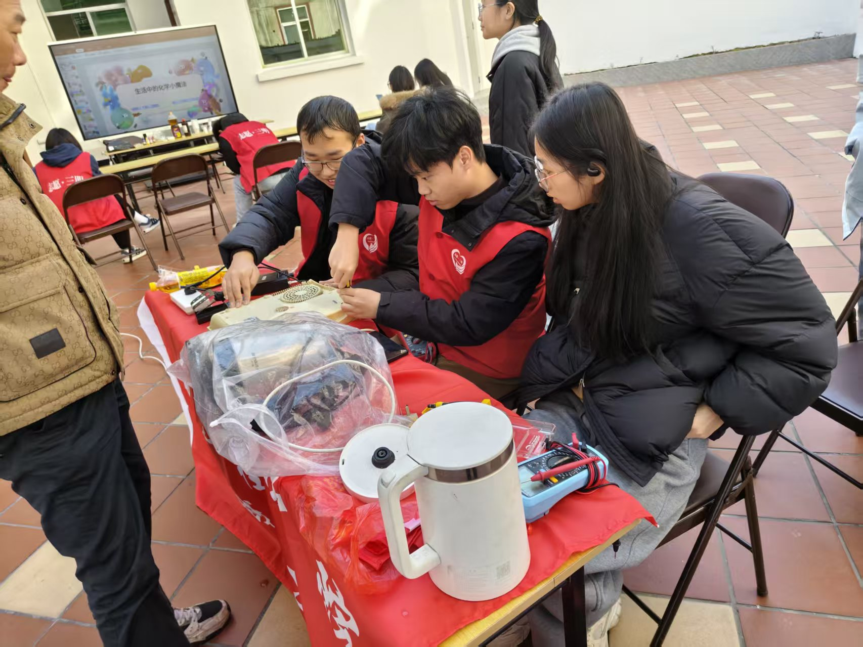 在“家电义诊”服务点,电子协会成员利用专业所学,为社区居民提供小型家电的免费检测、维修与安全使用咨询。从电风扇、电热水壶到台灯、收音机,队员们认真排查故障、耐心讲解保养常识,用专业技能切实解决居民生活难题。