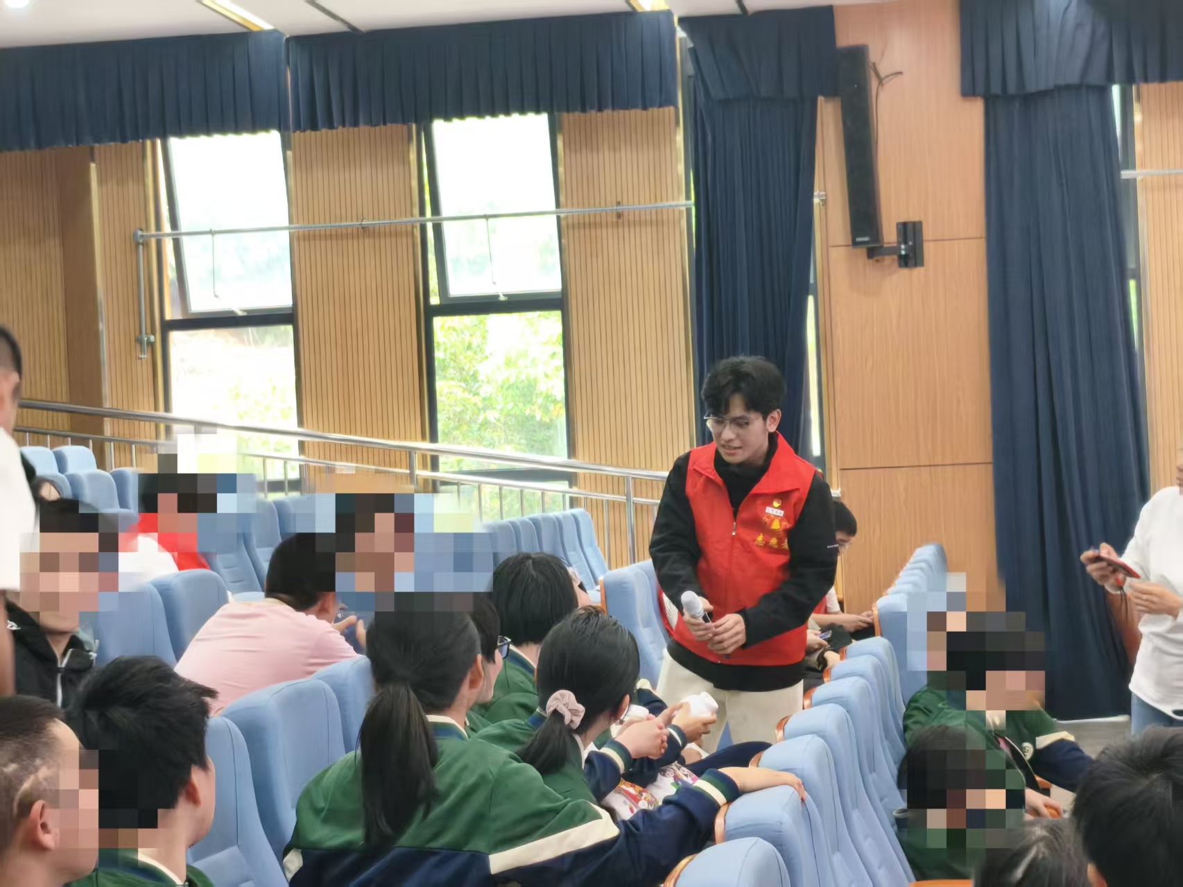 在特校大礼堂,活动在以手语“唱响”国歌中拉开帷幕。在特校老师的手语翻译配合下,学生党员代表带来一堂生动的多样微团课。在雷锋精神篇,学生以雷锋助人为乐的故事为引,结合机电专业志愿服务特色,阐释了新时代“螺丝钉”精神的深刻内涵。民族团结篇则通过观看短视频、有奖竞猜民族图片、少数民族志愿者上台表演等方式,生动地介绍了各民族特色。在欢快的课程尾声,参与活动的领导、老师为特校的同学们送上爱心礼包。