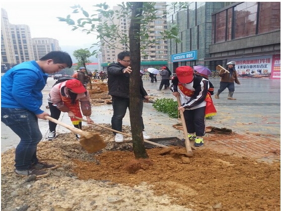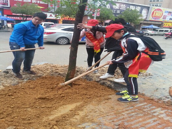 在水东新城植树现场,志愿者们按照团县委的统一要求,拿起锄头、铁锨,分工合作,耐心细致做好每一道植树工序。他们挥锹铲土,扶苗填坑,干劲十足,到处是一片热火朝天的劳动场面。在路旁我们可以看到同学们手拿铁铲和锄头一直忙碌不停,男生挖坑抬树,女生填土浇水,现场的老师们也加入了植树的行列,他们互帮互助,其乐融融,将一株株树苗种下,他们坚持着,绿色的体验,绿色的经历,绿色的未来离我们就不会遥远。