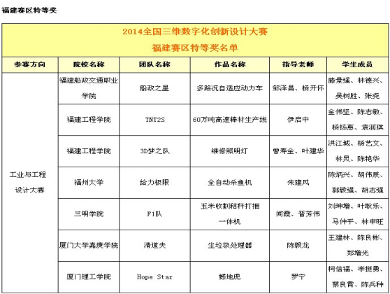 我院代表队在2014年第七届全国数字化创新设计大赛 福建赛区竞赛中获佳绩 日前,2014年全国第七届三维数字化创新设计大赛福建赛区复赛结果公布,我院取得福建赛区特等奖1项,一等奖9项(注:福建省赛区设置一等奖12项),二等奖8项,三等奖3项。此次比赛成绩是继2013年全国三维数字化创新设计大赛后在省级比赛中获得的新突破。 据悉,参加此次福建省赛区比赛的主要有福州大学、厦门大学、集美大学、厦门理工大学等省内各大高校,经过一番激烈的角逐,以及专家评审组的严格考核,我校代表队刘坤增、叶耿乐、马仲平、林申旺组成的F1队作品“玉米收割秸秆打捆一体机”(指导老师:闻霞、晋芳伟)获得了全国三维数字化创新设计3D大赛福建赛区特等奖;将代表福建省参加2014年全国第七届三维数字化创新设计大赛现场决赛。 全国3D大赛自2008年发起举办以来已连续成功举办至第7届,越来越受到各地方、高校和企业的重视,赛事规模不断扩大,参赛高校连续每年超过600所、参赛企业超过1000家,初赛参赛人数连续突破100万人;参赛作品水平不断提升,涌现出了一大批优秀设计作品与团队,备受业界关注;产学研合作与经科教联动不断深化,3D技术、人才与项目合作对接与产业链上下游带动的平台作用突显,已成为全国规模最大、规格最高、水平最强、影响最广的全国大型公益品牌赛事与3D行业盛会,正在为打造成为中国“创新设计”界的“奥斯卡”和“3D”界的“奥林匹克”目标而昂扬迈进!(机电工程学院 供稿) 获奖名单如下: |