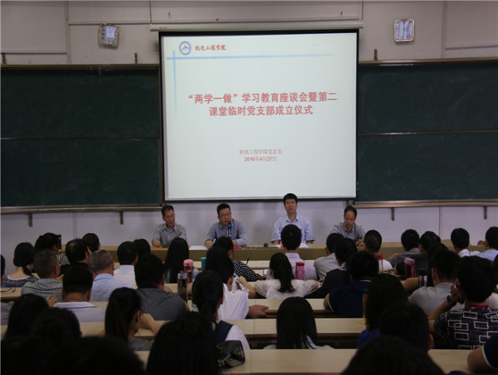 日前,机电工程学院在靖远楼101教室举行“两学一做”学习教育座谈会暨第二课堂临时党支部成立仪式,机电工程学院全体师生党员参加了活动,活动由机电工程学院党总支书记廖景榕主持。
