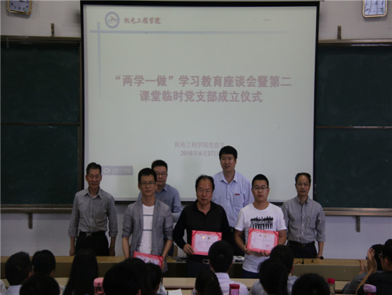 为践行“两学一做”,创新工作方式,机电工程学院成立了第二课堂临时党支部。活动仪式上,吴龙院长宣读了《关于成立第二课堂临时党支部的通知》,并现场对电子开放实验室临时党支部书记许国忠、机械创新设计协会临时党支部书记熊昌炯、梦速赛车俱乐部临时党支部书记陈刚颁发了聘任证书。第二课堂临时党支部的成立是落实当前开展“两学一做”学习教育活动,强化党组织和师生党员身份意识的一种具体做法,是创新学习教育载体的一次尝试,是党建工作主动融入机电工程学院“3355”人才培养模式的一种新探索。(机电工程学院 龚晓梅 供稿)
