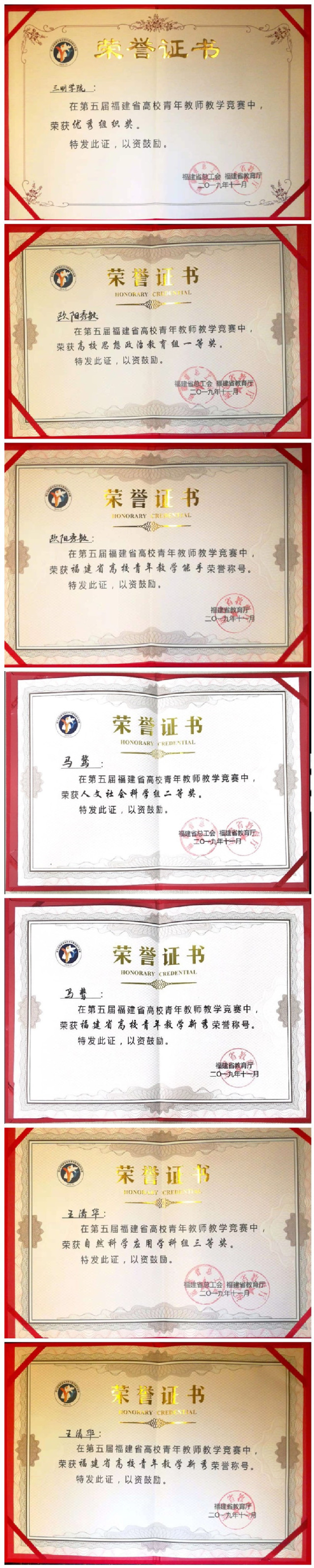 “一支粉笔写春秋,三尺讲台绽芳华”。11月1日-3日,由福建省总工会、福建省教育厅主办的“第五届全省高校青年教师教学竞赛”在集美大学举行,我校推荐的三位教师全部获奖,马克思主义学院教师欧阳秀敏荣获思想政治教育课组一等奖,同时被授予“福建省高校青年教学能手”荣誉称号;艺术与设计学院教师马骜荣获人文社会学科组二等奖,建筑工程学院教师王清华荣获自然科学应用学科组三等奖,两位教师同时被授予“福建省高校青年教学新秀”荣誉称号。我校获得“优秀组织奖”荣誉称号。
