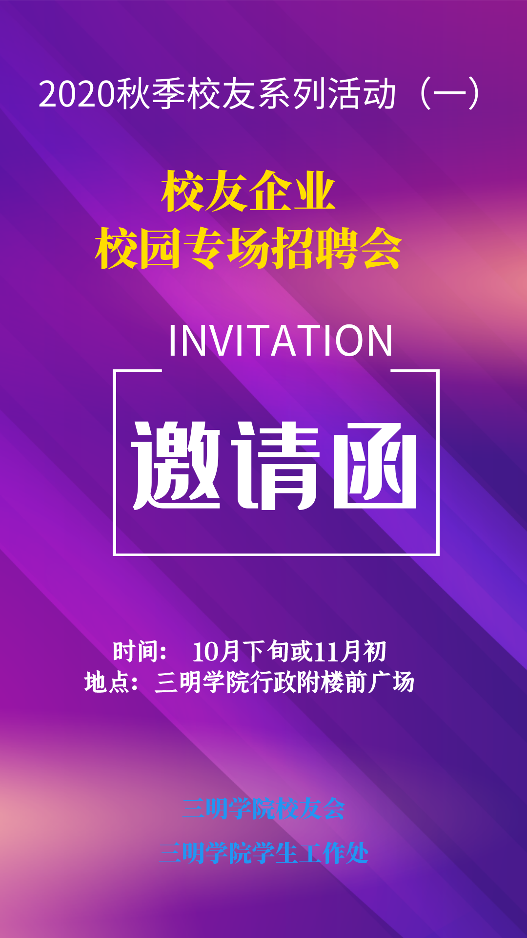 为贯彻落实党中央、国务院关于“稳就业”、“保就业”工作重要决策部署,进一步加强母校和校友间的合作交流,促进毕业生高质量就业,学校拟于10月底或11月初举办三明学院2020年校友企业校园专场招聘会。现将有关事项通知如下: