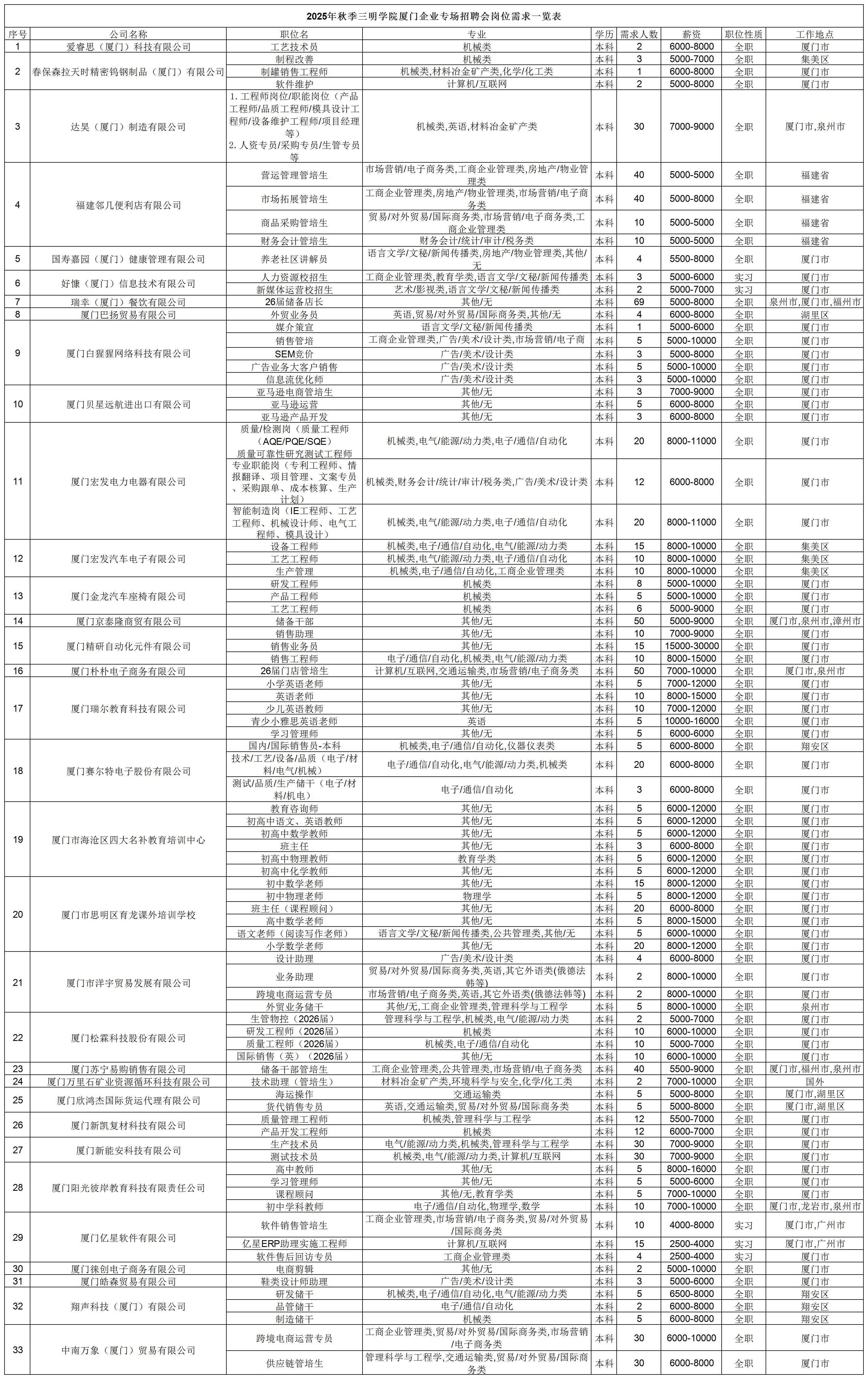 附件1:2025年秋季三明学院厦门企业专场招聘会岗位需求一览表