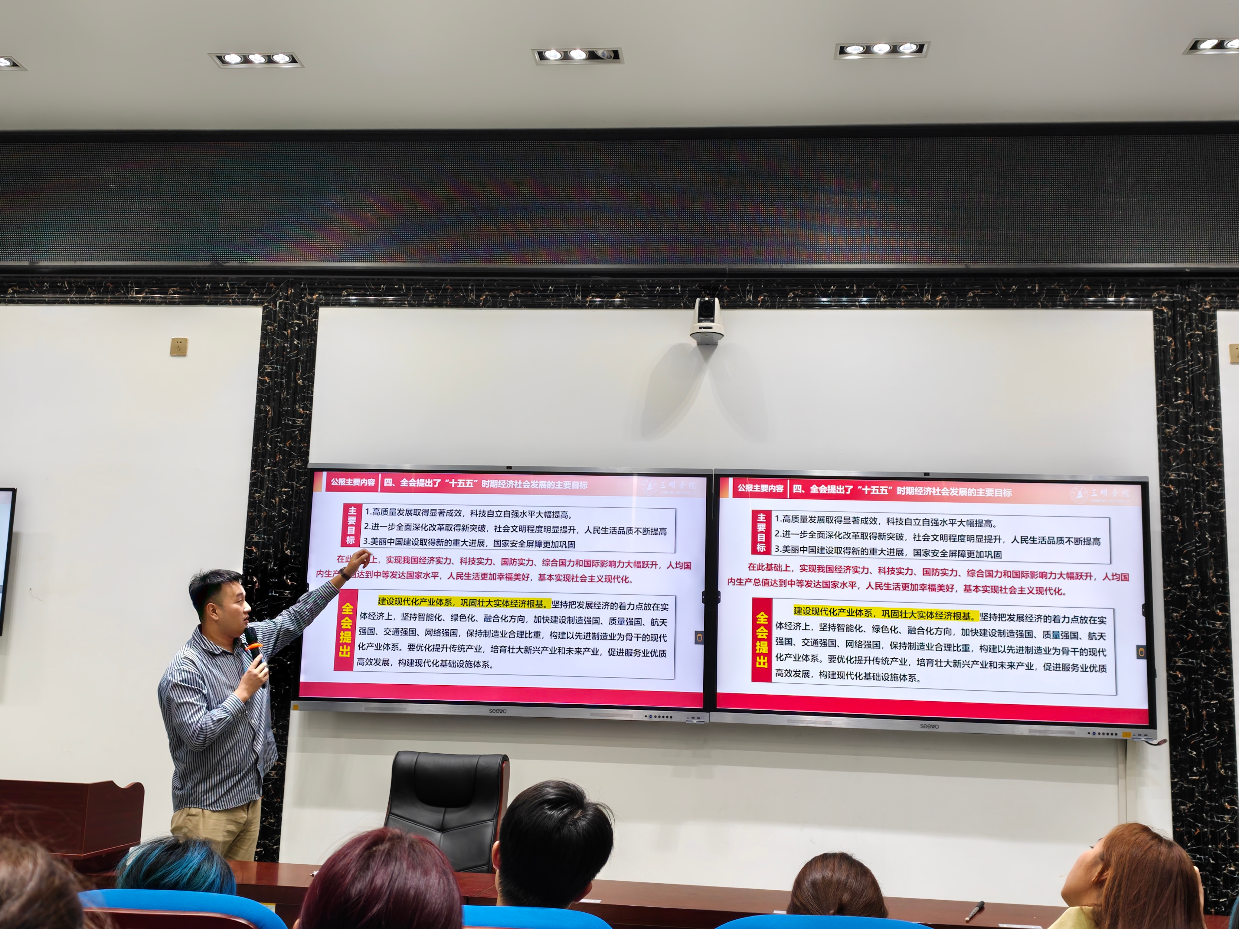 党支部书记梁思宇围绕党的二十届四中全会核心要义展开讲解,结合公报原文与权威解读,从文明逻辑、实践导向、阶段定位、世界价值四个维度深入阐释全会精神。他重点解读了全会提出的“加快高水平科技自立自强,引领发展新质生产力”等重大部署,强调全会明确的“十五五”时期发展原则与目标,是新时代青年成长成才的行动指南。