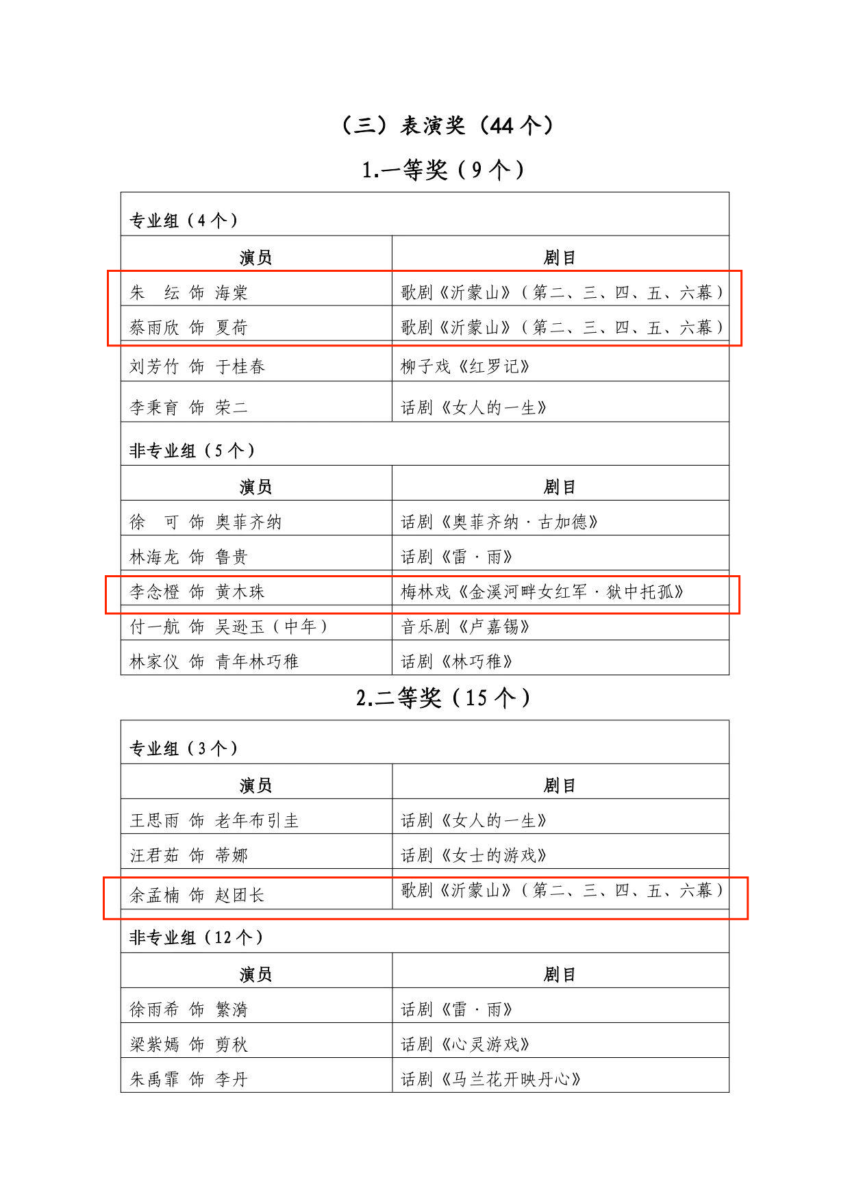 个人奖项方面,朱纭、蔡雨欣凭分别借在《沂蒙山》中成功塑造海棠、夏荷两角,双双荣获专业组一等奖;余孟楠、张景舜也因在该剧中的出色表现,分获专业组二、三等奖。李念橙在梅林戏《金溪河畔女红军·狱中托孤》中饰演黄木珠,以真挚感人的表演荣获非专业组一等奖,展现出学院艺术教育的广泛基础与人才挖掘能力。