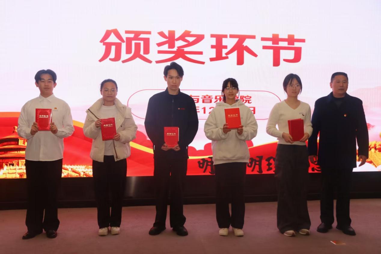 为深入学习贯彻党的二十届四中全会精神,引导青年学子坚定理想信念、强化使命担当,12月3日,教育与音乐学院学生党支部在图书馆学术报告厅举办了一场别开生面的“学思践悟新思想,青春建功新时代”主题党日活动。校党委副书记李莉星、院党委书记伍荣生、院长艾述华、院党委副书记缪大旺出席活动,学院全体在校学生党员与入党积极分子积极参与。