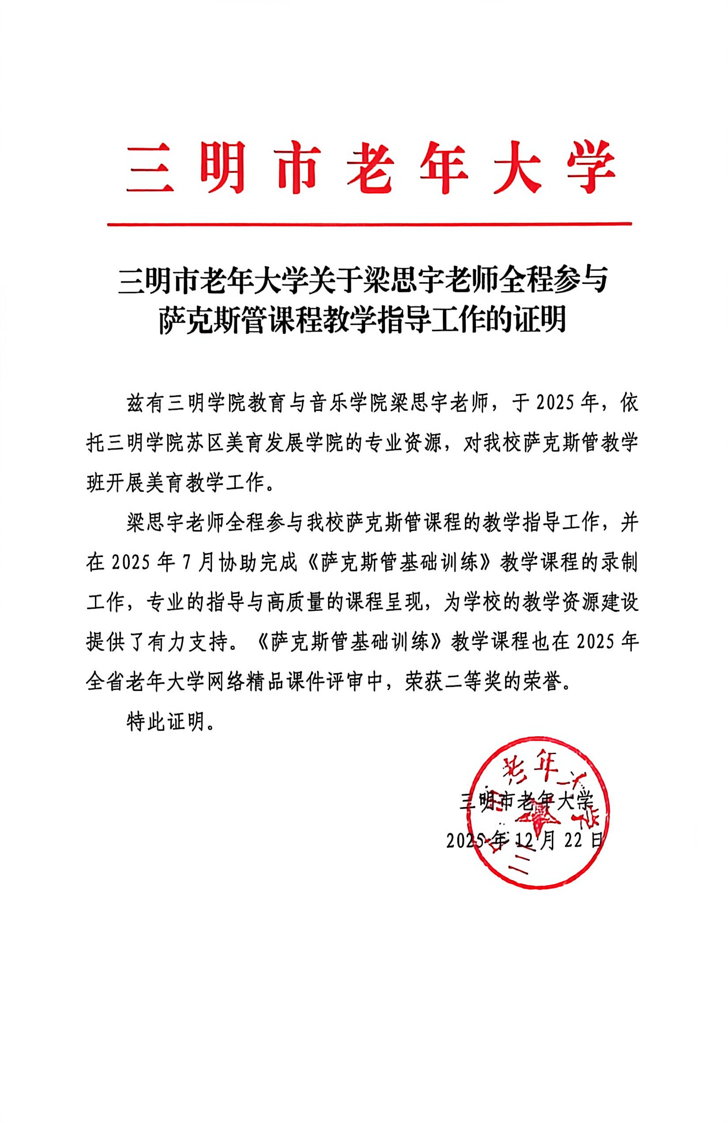 在扎实开展线下教学的基础上,为突破时空限制,让更多老年群体共享优质美育资源,三明学院两学院深度帮扶三明市老年大学,联合开发《萨克斯管基础训练》数字教材。研发团队将线下课程的核心内容进行数字化转化,融入高清演奏示范、分步拆解教学、互动答疑等模块,既保留专业教学的严谨性,又适配老年群体线上学习的习惯,打造出兼具实用性与趣味性的网络精品课件。此次获奖,既是对校地联合研发成果的肯定,更是对高校践行社会责任、深耕老年美育帮扶的有力佐证。