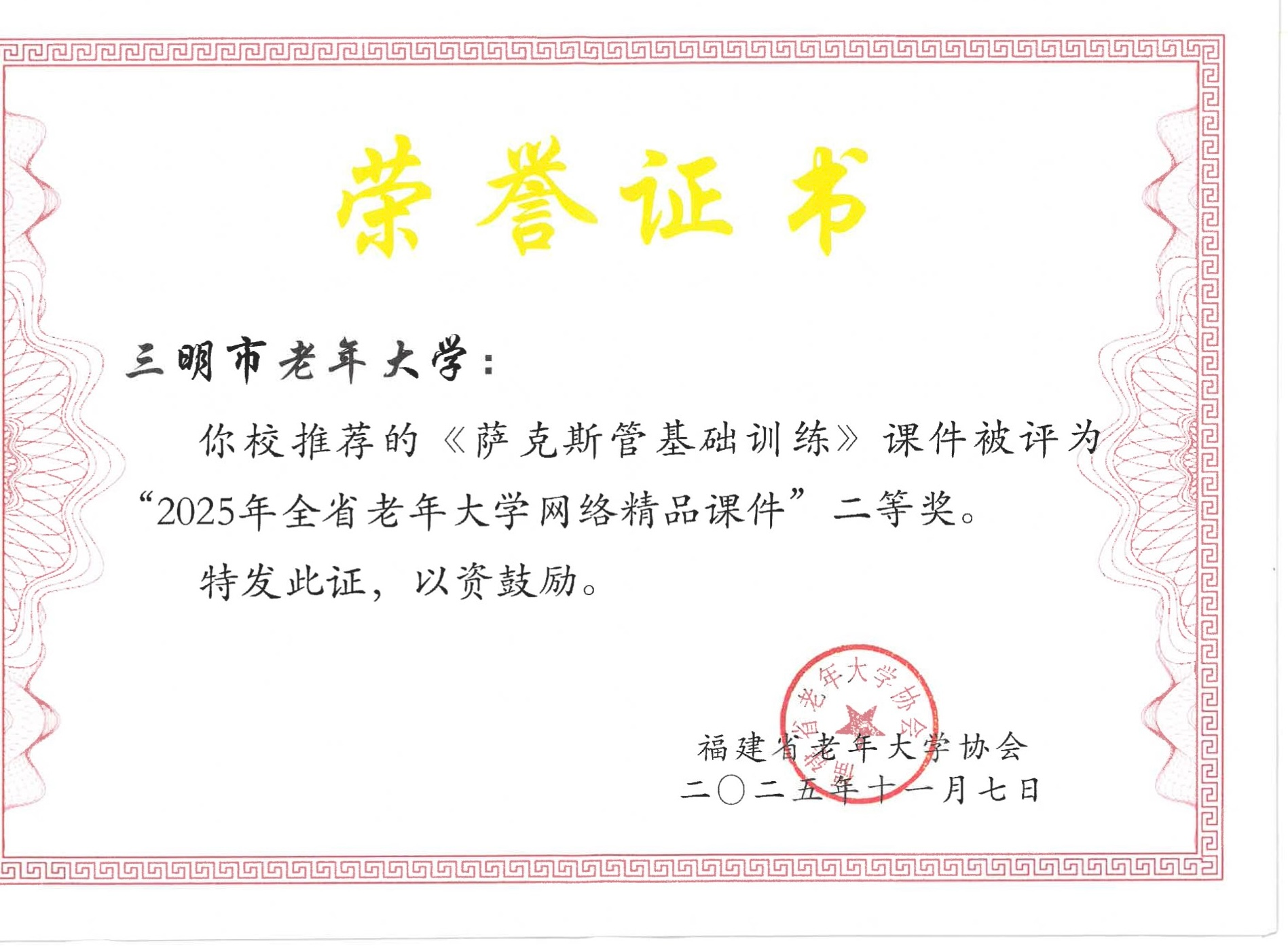近日,由三明学院教育与音乐学院联合苏区美育发展学院,帮扶三明市老年大学研发的《萨克斯管基础训练》数字教材课件,在2025年全省老年大学网络精品课件评选中荣获二等奖,校地协同赋能老年美育的实践成果再获省级认可。