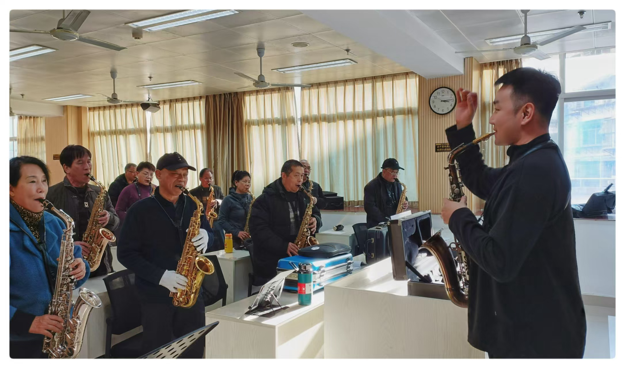 自2025年起,三明学院秉持尊老爱老的传统美德,发挥艺术专业与美育资源优势,选派梁思宇老师对口开展三明市老年大学萨克斯管课程帮扶工作。课程采用常态化教学模式,每学期每周开设两个学时的专属美育课程,针对老年学员的学习节奏和生理特点,量身定制教学内容,从乐器持握、气息控制等基础技巧,到经典曲目改编演奏,均进行细致讲解与手把手指导,让老年学员在轻松愉悦的氛围中感受音乐魅力,丰富精神文化生活。