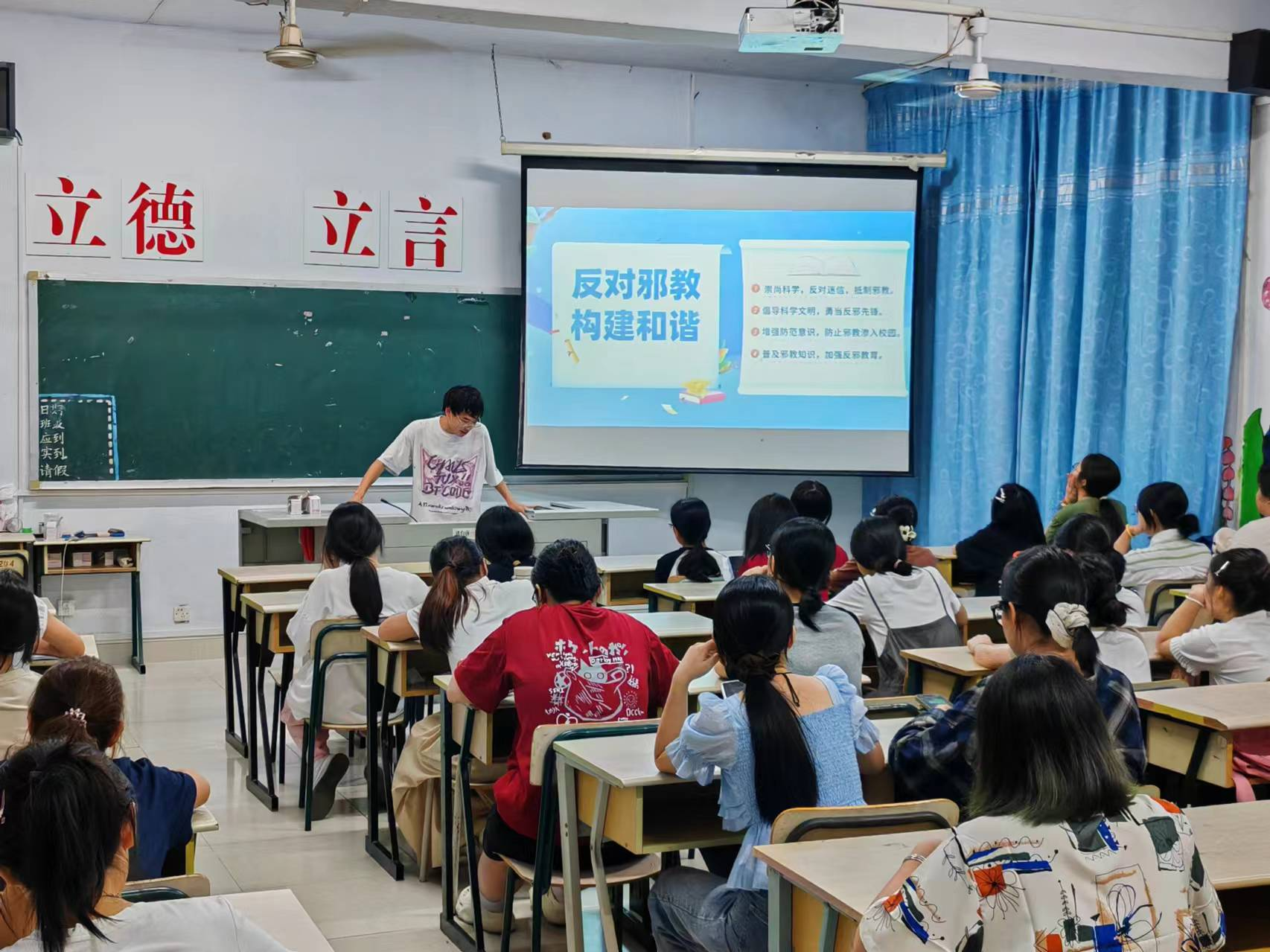 学院线上依托微信公众号开设“反邪小课堂”专栏,推送科普图文、典型案例解析,发起“远离邪教我承诺”网络签名活动;线下在教学楼、音乐厅等场所设置宣传展板,揭露邪教反人类、反科学的本质。