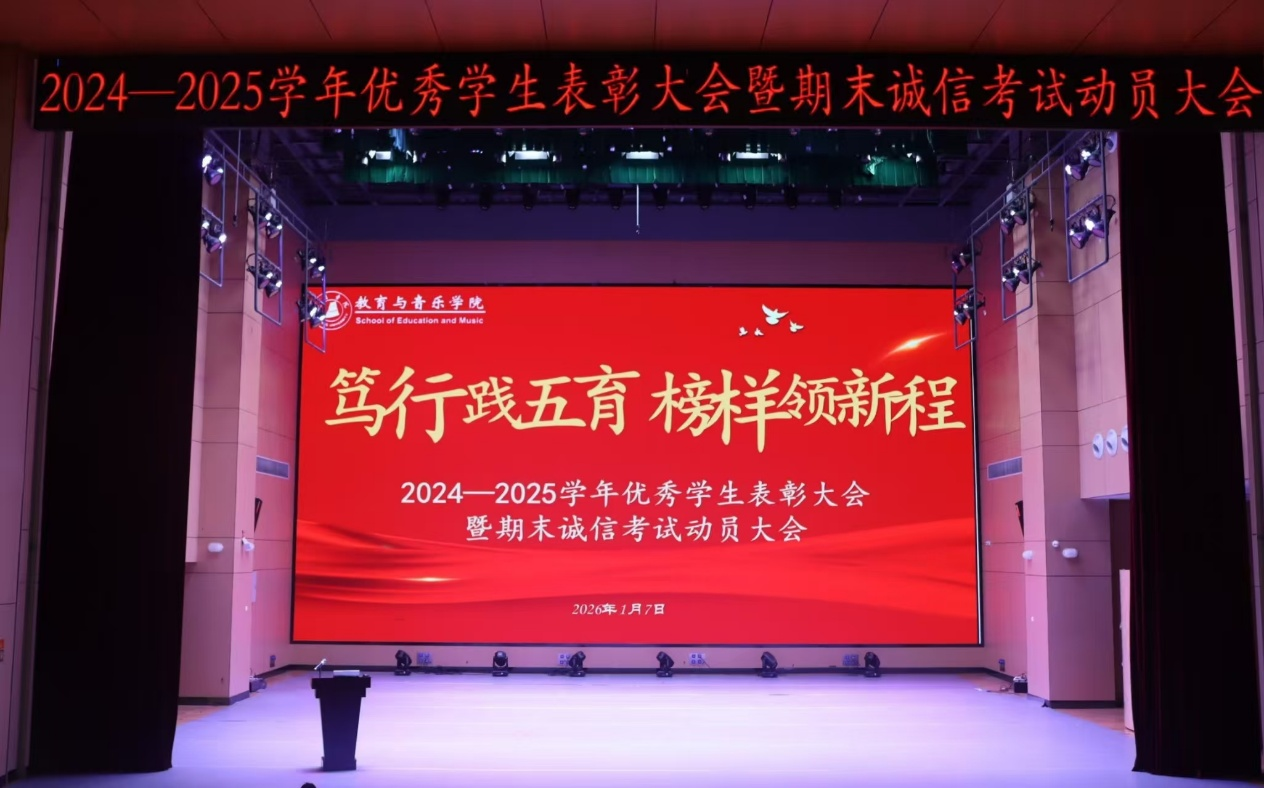 1月7日,教育与音乐学院在音乐厅召开2024-2025学年优秀学生表彰大会,集中表彰在学业、实践与服务中涌现出的先进典型,激励全院学子对标先进、勤学笃行,凝聚推动学院高质量发展的青春力量。学院党委领导班子、各系主任、科室负责人、辅导员及各年级学生代表参会,音乐厅内座无虚席,氛围庄重热烈。