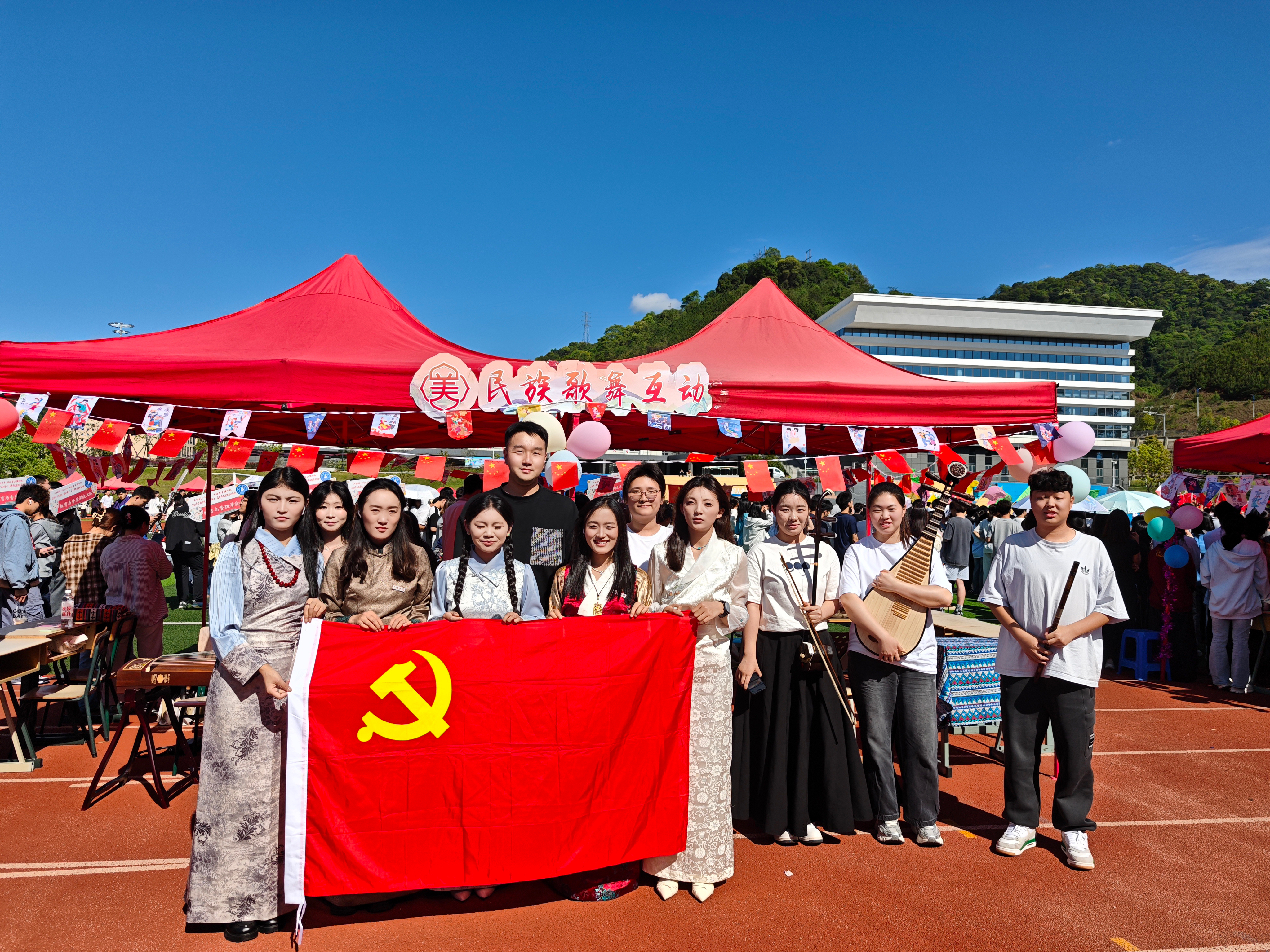 随后,党员学生化身文化讲解员与教学志愿者,在民族乐器展示区开展展示展演与互动教学。古筝、琵琶、竹笛、芦笙等乐器依次亮相,经典民族曲目悠扬奏响;党员手把手指导各民族同学体验演奏技巧,在交流互动中增进文化认同、拉近民族情谊,为嘉年华营造浓厚艺术氛围,以专业服务践行初心使命。