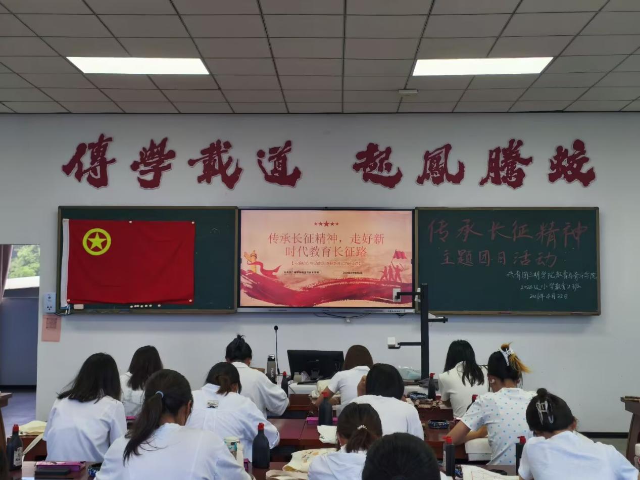 活动还紧密结合师范专业特色,开展长征诗词书写实践,以三笔字书写红色经典,于一笔一画中锤炼教育基本功。党支部党员现场示范书写技巧,耐心指导团员提升书写规范,发挥传帮带作用。围绕长征历史、重要战役及英雄事迹等内容展开的知识竞答环节,党员与团员混合组队、同台竞答,以赛促学,进一步巩固学习成果。