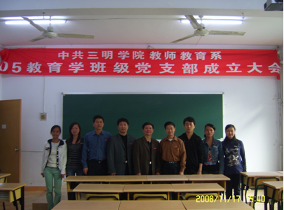 2008年11月17日,我系在理工一(222)举行了中共三明学院教师教育系05教育学班级党支部成立大会,05教育学班级党支部为我系第一个班级党支部。大会由系学生党支部书记陈登平老师主持,系党总支书记曾念强老师、党总支副书记伍荣生老师、系副主任张清水老师、系学生党支部副书记林昌老师及学生党员参加了会议。首先伍荣生老师发言,伍荣生老师强调了班级学生党支部成立的重要性,及大学生党员如何在发挥纽带作用,在学风建设和构建和谐社会方面发挥先锋模范作用。接着通过民主选举的形式, 选举产生05教育学班级党支部的支部委员,并决定朱晓娟同学担任班级党支部书记,陈美婉、孙秋婷、黄雪云三个同学担任班级党支部委员。最后党总支书记曾念强老师对班级学生党支部的成立表示了祝贺,并对学生党支部和支部委员提出了希望。他提出学生党支部是党的基层组织,是核心力量,要成为学生活动的优秀组织,带动集体发展,发挥战斗堡垒作用;班级党支部的支委要牢记职责,加强理论学习,不断加强自身的党性修养,培养团队意识,在实践中增长才干。