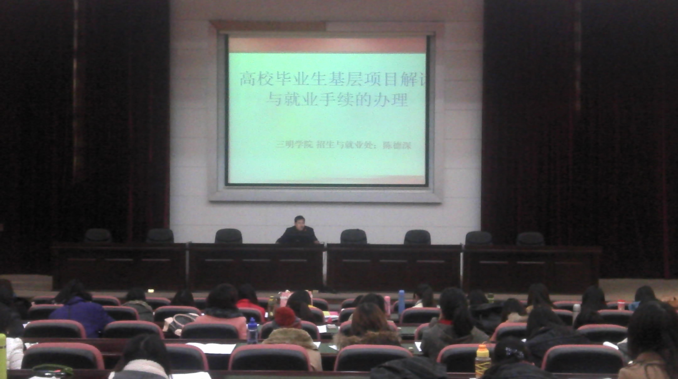 接着,陈德深科长作了题为《高校毕业生基层项目解读与就业手续的办理》的讲座。陈老师从解读最新就业政策入手,详细地向大家介绍了高校毕业生基层项目,并结合三明学院往届毕业生的就业实例,说明了基层锻炼有着广阔的发展空间和丰富的历练机会,鼓励同学们积极参与到基层工作中去。他详细讲解了就业和择业的各个程序,强调应该注意的各个细节,还介绍了人事代理及其作用,强调了就业协议书和报到证等就业材料的重要性,要求同学们重视就业手续的办理。最后,陈老师也给2013届毕业生提出了希望,希望全体毕业生立足当下、把握未来,不断学习和锻炼自己,并祝愿毕业生们心想事成,在毕业之后能够走出一条宽广的路,努力成为一个对国家、对社会有用的人。
