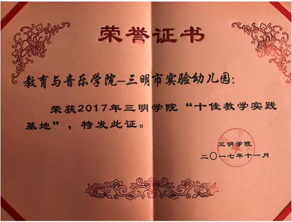 据悉,今年是学前教育专业与三明市实验幼儿园共建教学实践基地的第五个年头。五年来,在三明市实验幼儿园的高度重视与支持下,教育与音乐学院的实践教学得以更加高效优质地推进。在2017年的教学相长月中,三明市实验幼儿园被评选为三明学院“十佳教学实践基地”。