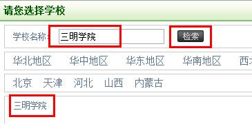 点击“学校”后面的空白栏,出现如下界面,在空白处输入“三明学院”,点“检索”,单击下面空白框里的“三明学院”学校即选择上。