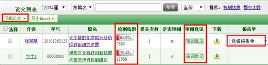 教师可通过此功能查看自己所带学生的论文检测结果及报告单,可下载论文原文,提供审阅意见等。