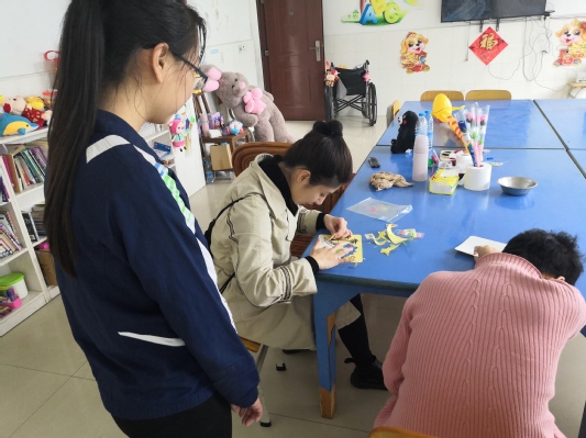活动期间,工作人员拿出故事书和画画工具,同学们和小朋友一起给图画上色,同学们手把手的帮小朋友撕开贴纸、涂上颜色。虽然大部分孩子是有一定缺陷的,但他们的内心世界丰富多彩,活波可爱。用心挑选颜色、认真涂染。图画制作完成后,志愿者与小朋友们一同分享劳动成果。结束时,同学们不忘帮忙打扫卫生,和孩子们挥手道别。